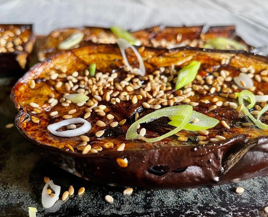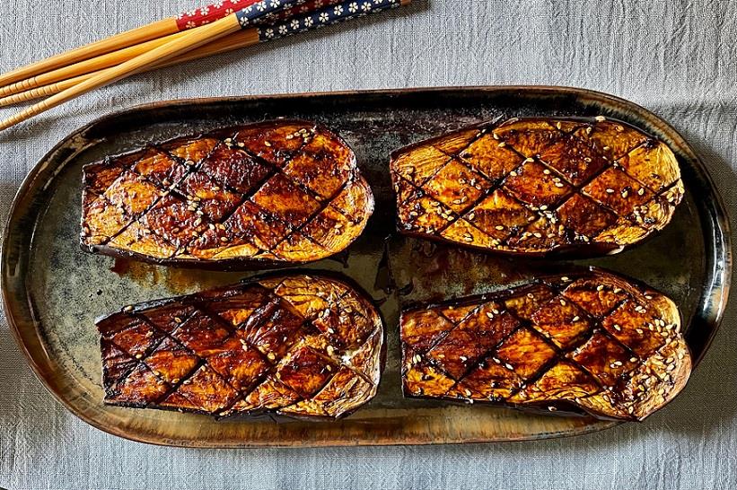 Πλένουμε 4 μελιτζάνες φλάσκες, τις σκουπίζουμε και τις κόβουμε στη μέση κατά μήκος. Με τη μύτη ενός μαχαιριού τις χαράζουμε μπακλαβαδωτά, προσέχοντας να μην πάμε πολύ βαθιά μέσα στη σάρκα για να μη διαλυθούν. Αλείφουμε την επιφάνεια με ελάχιστο ασιατικό σησαμέλαιο (sesame oil) και τις τοποθετούμε με την κομμένη και αλειμμένη πλευρά προς τα κάτω στη λαμαρίνα του φούρνου που έχουμε στρώσει με λαδόκολλα. Τις ψήνουμε για 15’ σε προθερμασμένο φούρνο στους 190ο C.