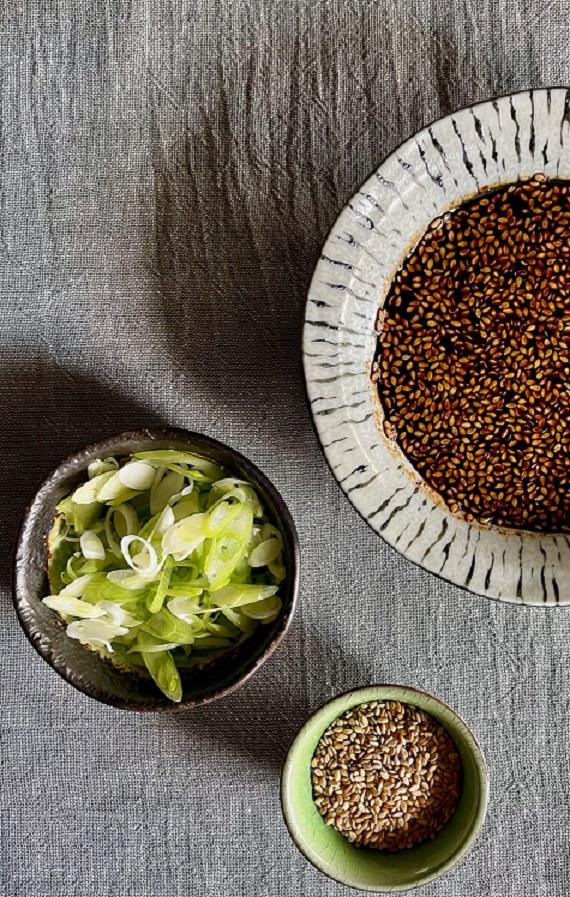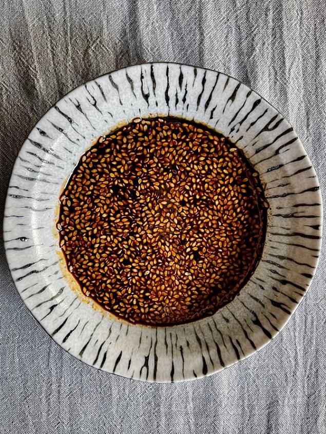 Όσο ψήνονται οι μελιτζάνες, ετοιμάζουμε τη sauce teriyaki : ανακατεύουμε ½ φλ. τσ. soy sauce, ¼ φλ. τα. ιαπωνικό ξύδι από ρύζι mirin, 2 κοφτές κ.σ. καστανή ζάχαρη, 1 κομμάτι ginger ίσο με το μεγάλο μας δάχτυλο του χεριού ψιλοτριμμένο, 1 μικρή σκελίδα σκόρδου ψιλοτριμμένη ή λιωμένη με το ειδικό εργαλείο (εγώ έβαλα 1 κ.γλ. πολτό μαύρου σκόρδου που είχα στο ψυγείο μου, το οποίο μου αρέσει πολύ για τη βαθιά του γεύση και το λιγότερο έντονο άρωμά του) και 1 κ.σ. σουσάμι. Ανακατεύουμε καλά μέχρι να λιώσει η ζάχαρη.