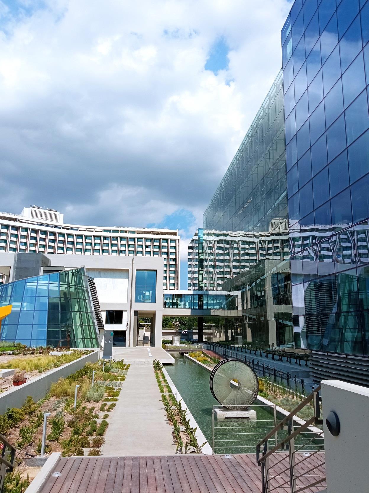 Το νέο, ριζικά ανακαινισμένο κτίριο της Εθνικής Πινακοθήκης είναι κι αυτό ένα έκθεμα από μόνο του: Οι ράμπες που αγκαλιάζουν το κτίριο και ανεβοκατεβαίνουν τους ορόφους από την εξωτερική πλευρά παρέχουν άπλετη θέα στην πόλη μέσα από τις γυάλινες προσόψεις. Στον κήπο το βλέμμα τραβάει το υδάτινο κανάλι που αναπαριστά τον Ιλισσό, έναν από τους τρεις ποταμούς της Αθήνας, ο οποίος εξακολουθεί να κυλά υπόγεια εδώ. Στους εξωτερικούς χώρους, τα γλυπτά του Κώστα Βαρότσου, του Γιώργου Ζογγολόπουλου και του Auguste Rodin συνομιλούν με την αέναη κίνηση τόσο μέσα όσο και έξω από το κτίριο.