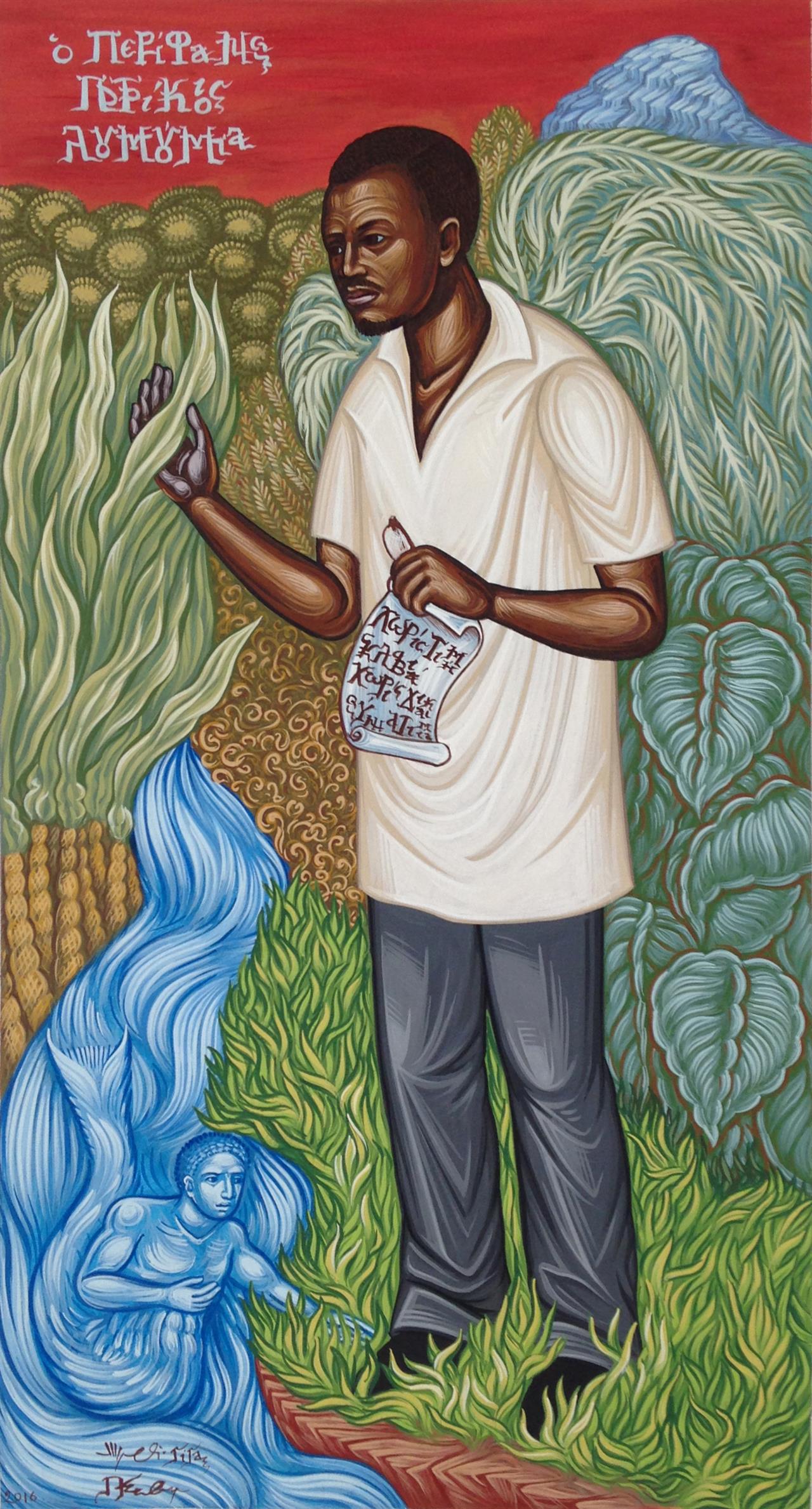 «Όταν ξεκίνησα να ζωγραφίζω δεν χρησιμοποιούσα αυτό το ιδίωμα που έχει αναφορές στη βυζαντινή τέχνη, γιατί δεν το είχα διδαχθεί. Στη Σχολή Καλών Τεχνών όμως έτυχε να έχω έναν εξαιρετικό καθηγητή στην αγιογραφία, τον Κωνσταντίνο Ξινόπουλο», θα μου πει εξηγώντας τις καταβολές της γραφής του. «Με ενδιέφερε ούτως ή άλλως η μοντέρνα προσέγγιση, ο σουρεαλισμός, το νταντά, ο εξπρεσιονισμός και επειδή μεγάλωσα με τα κόμικ, τη λαϊκή τέχνη και παρατηρώντας τις επιγραφές στο δρόμο τα χρησιμοποιούσα. Όλα αυτά είναι πάρα πολύ κοντά στην βυζαντινή τεχνική. Η βυζαντινή τέχνη έχει χαρακτηριστικά οικουμενικά και αυτό τη βοηθά να γίνει κατανοητή. Το σχέδιο, την πτυχολογία της άλλωστε τη βλέπουμε και πιο πριν. Στις τοιχογραφίες στους μακεδονικούς τάφους, στα φαγιούμ. Η ελληνική τέχνη έχει μία διαχρονία και μελετώντας, έβλεπα ότι αυτή η παράδοση είναι το μοντέρνο των τελευταίων 2.500 χρόνων».