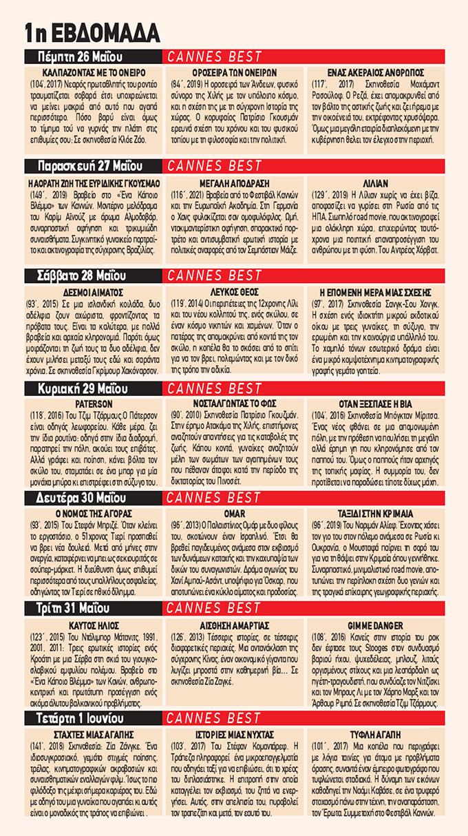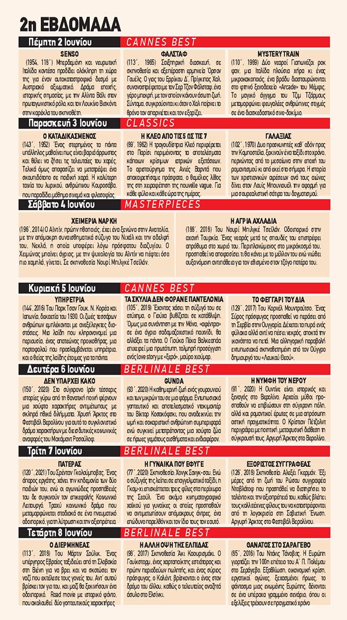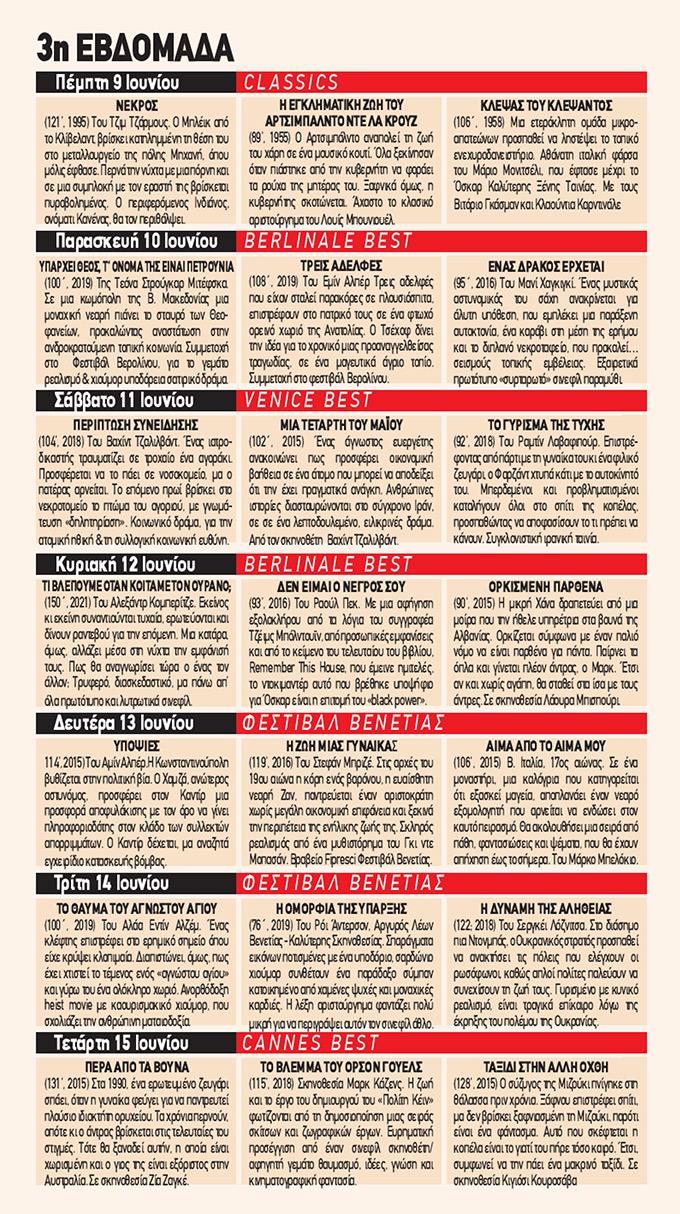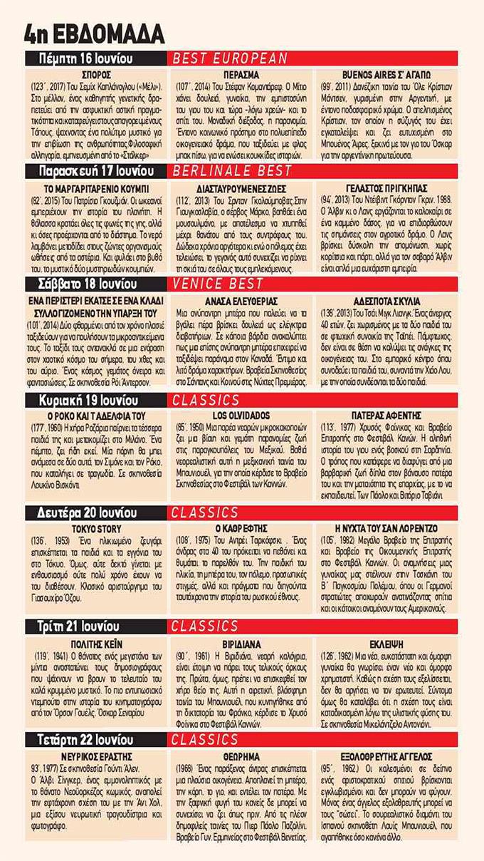 Οι ώρες προβολών θα είναι 18.00, 20.00 και 22.00, ενώ το πρόγραμμα έχει ως εξής: