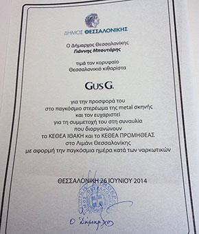 Ο Κώστας Καραμητρούδης – κατά metal κόσμον Gus G – βραβεύτηκε από τον δήμαρχο της Θεσσαλονίκης για την συνεισφορά του στην διεθνή μουσική σκηνή.