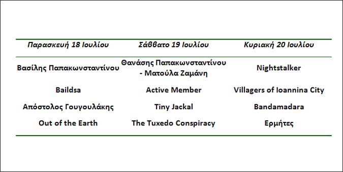 Το μουσικό πρόγραμμα φέτος περιλαμβάνει πολλούς αγαπημένους τραγουδιστές και συγκροτήματα που θα γεμίσουν με μουσικές νότες τα βράδια μας στο βουνό.