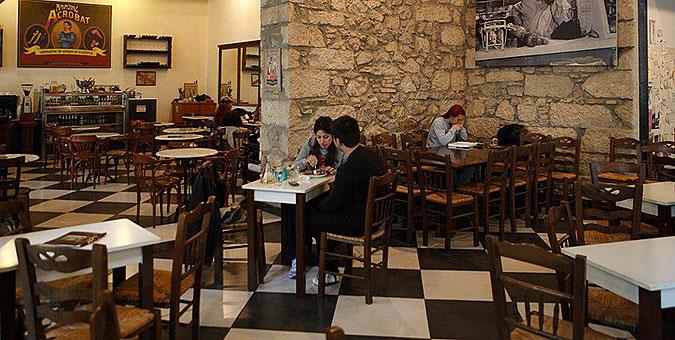 Ακροβάτης Ψαρρών 26 και Μαιζώνος, τηλ.: 210 5230750 Το καταπληκτικό νεοκλασικό κτίριο όπου γυρίστηκε ο Μπακαλόγατος με τον Χατζηχρήστο στεγάζει τον υπέροχο Ακροβάτη, ένα μεζεδοπωλείο-ρακομελάδικο-μπαρ που αγαπά τις σπιτικές γεύσεις, τις live μουσικές και τις καλλιτεχνικές πινελιές στο ατμοσφαιρικό του περιβάλλον. Στο λαχταριστό μενού περιλαμβάνονται γεύσεις όπως φέτα με μέλι και μαρμελάδα ντομάτας, καναπεδάκια ψητών λαχανικών με ταλαγάνι, απάκι με πορτοκάλι, λουκάνικα Τρικάλων και ολόφρεσκο ζυμωτό ψωμί. Ουζάκια και ρακόμελα ρέουν άφθονα, και οι τιμές κυμαίνονται στα 10-15€ το άτομο.