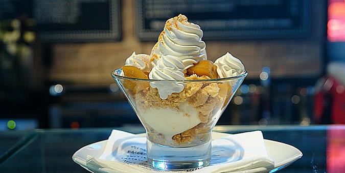 Almond Apple Crumble Η δική μας frozen μηλόπιτα με καραμελωμένα μήλα, παγωτό βανίλια και crumble αμυγδάλου.