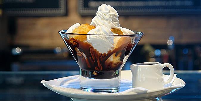 Γαλλικό Profiterole Με γέμιση παγωτό βανίλια ή σοκολάτα και απολαυστική bitter chocolate ganache.