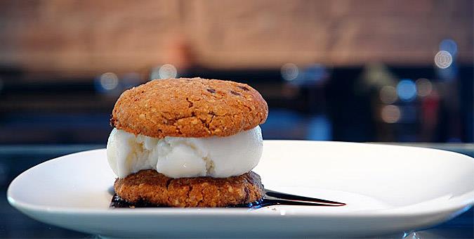 Healthy Ice Cream Sandwich Με soft cookies από βρώμη με bitter chocolate και sugar fat free παγωτό.