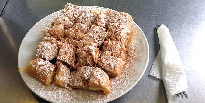 Μπουγάτσα Δήμος Αγίου Σπυρίδωνος 25, Τριανδρία, τηλ: 2310929920 Σε ατμόσφαιρα παλιού αναψυκτήριου, ο κύριος Δήμος στην Τριανδρία φτιάχνει καθημερινά χειροποίητη λαχταριστή μπουγάτσα με παχιά, αφράτη κρέμα και τραγανό φύλλο. Δοκιμάστε και αυτή με την μερέντα – οι μπουγάτσες κυμαίνονται στα 1,70-2€.