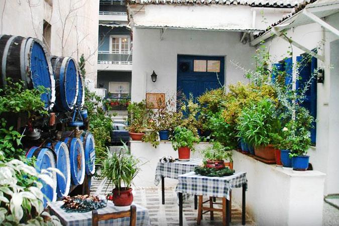 Γιατί μας αρέσει: Για την χρωματιστή αυλίτσα με τα χτιστά καναπεδάκια, τις γλάστρες και τα μικρά δέντρα, αλλά και για τον συμπαθέστατο εσωτερικό του χώρο, που παραπέμπει σε παλιό μπακάλικο.