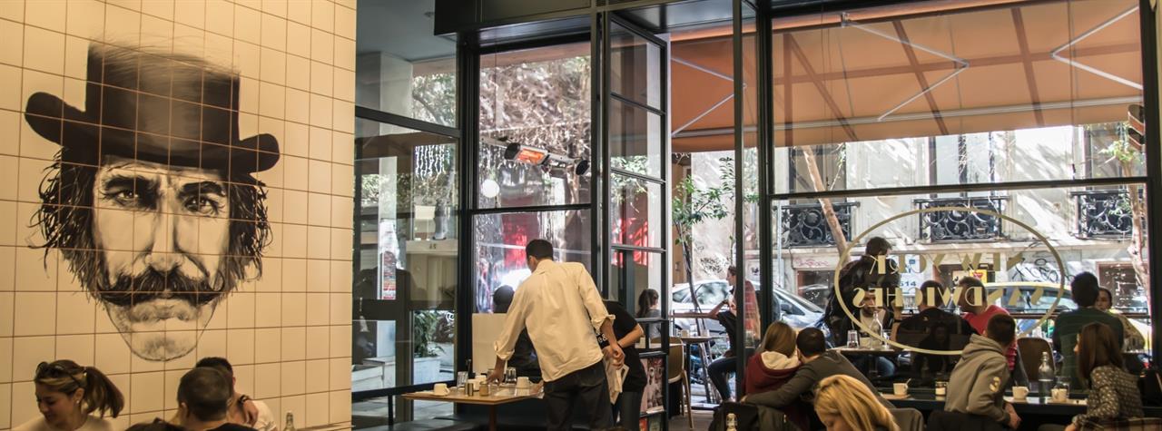 New York Sandwiches Σινώπης 3, τηλ.: 210 7778475 Γεύση από Μανχάταν φέρνει κάτω από τον ψηλότερο «ουρανοξύστη» της πόλης, στην σκιά του Πύργου των Αθηνών, αλλά και στο Σύνταγμα, το New York Sandwich, που σύστησε στην Αθήνα τον «νεοϋορκέζικο» τρόπο γεύματος: Στον μικρό, μακρόστενο χώρο του με τους χάρτες και τα memorabilia του «Μεγάλου Μήλου» απλώνονται μεγάλοι πάγκοι όπου κάθονται περισσότερες από μία παρέες και απολαμβάνουν λαχταριστά σάντουιτς, burgers και σαλάτες, αλλά και ανάρπαστο brunch τα Σαββατοκύριακα. Στα αγαπημένα μας συγκαταλέγονται το ιδιαίτερο pastrami sandwich με βοδινό delicatessen, σως από μουστάρδα και πίκλες σε φρέσκο χωριάτικο χωμί και το chicken parm με κοτόπουλο πανέ και παρμεζάνα σε ψωμάκι Kaiser bun. Για ένα καθωσπρέπει αμερικάνικο γεύμα υπολογίστε περί τα 15€.