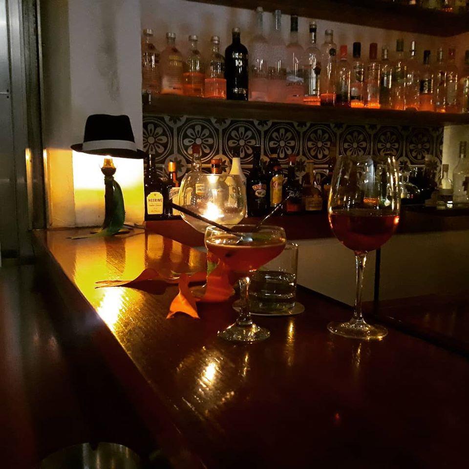 Είναι χαλαρό και παρεΐστικο, με χαμηλό φωτισμό και πορφυρούς τοίχους. Παίζει χαμηλά μουσική και έχει όμορφη ρετρό διακόσμηση που μας προδιαθέτει ευχάριστα να πιάσουμε θέση στη μπάρα ή στα αραιά τοποθετημένα τραπεζάκια του και να κουβεντιάσουμε περί ανέμων, υδάτων και παραστάσεων. Καθαρά ποτά και κλασικά κοκτέιλ μπαίνουν στην εξίσωση, ενώ νόστιμα σνακ κόβουν τη λιγούρα από τη δίωρη παράσταση και συνοδεύουν ωραία την ποτο-κατανάλωση. Το απλό ποτό στα 6€.