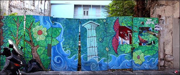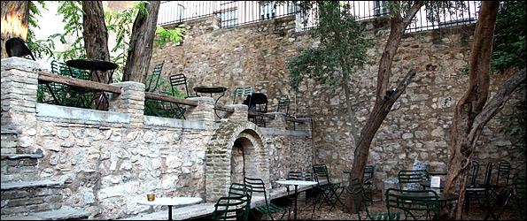 Ακόμη κι αυτή η δεύτερη εικόνα δεν υποψιάζει για την όαση πρασίνου στην οποία θα βρεθείτε σε λίγα δευτερόλεπτα. Γυρνώντας προς τα δεξιά αντικρίζετε πανύψηλα, καταπράσινα δέντρα να προσφέρουν απλόχερα τη σκιά τους στα εξίσου πράσινα τραπεζάκια καφενείου, στα χτιστά πεζούλια και τα πέτρινα τειχάκια που έχουν διαμορφωθεί έτσι ώστε το περιβάλλον να αποπνέει αέρα παρεΐστικο και ατμόσφαιρα κυριακάτικης εκδρομής. Το αρτίστικ περιβάλλον συμπληρώνεται από πινελιές τέχνης στα πιο απίθανα σημεία –από τα παντζούρια των παραθύρων των κτιρίων που περιστοιχίζουν τον κήπο, μέχρι τυχαία σημεία των τοίχων.