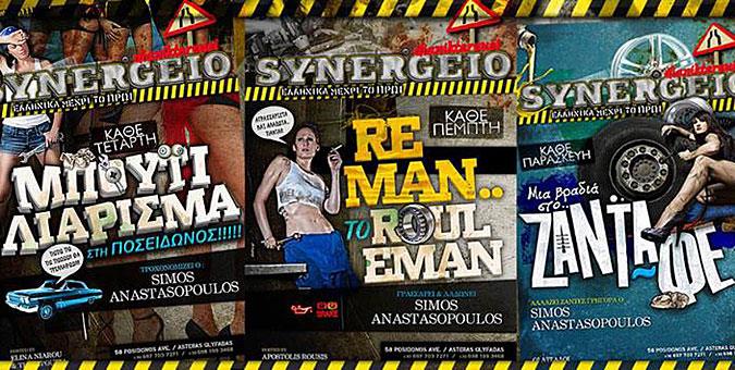 Συνεργείο (Αστέρας Γλυφάδας, τηλ: 697 703 7271) Η ομάδα της «Β’ Παθολογικής» αποφάσισε να το γυρίσει από τα επείγοντα περιστατικά στις… επισκευές και κάπως έτσι το «Συνεργείο» με μότο του το «Ελληνικά με steel» και αυτοχαρακτηριζόμενο ως «ελληνάδικο – ξεφτιλάδικο» κάνει ρεκτιφιέ στην ελληνική διασκέδαση της Παραλιακής. Τα party του είναι όλα ένα και ένα και δεν άργησαν να κερδίσουν τον κόσμο με το κέφι και τα πρωτότυπα ονόματά τους: Ρε Μαν το Ρουλεμάν κάθε Πέμπτη, Μια Βραδιά στο Ζάντα Φε κάθε Παρασκευή, Γρανίτα από Μπουλόνι τα Σάββατα, και Μπουτιλιάρισμα στην Ποσειδώνος κάθε Τετάρτη. Στα decks ο resident dj ο Σίμος Αναστασόπουλος. Η είσοδος είναι ελεύθερη, ενώ το ποτό κοστίζει 8€.