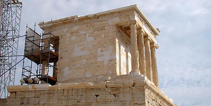 Τον ναό της Αθηνάς Νίκης, στα δεξιά των Προπυλαίων, οι «πρωτάρηδες» τον προσέχουν μόνο κατεβαίνοντας –γιατί κατά κανόνα είναι πολύ απασχολημένοι να κοιτούν προς τα πάνω, πίσω από ποιο από τα επόμενα σκαλιά θα φανεί ο Παρθενώνας. Αν υπήρχε κι άλλη έξοδος, θα λέγαμε ότι είναι κρίμα: Ο μικρός ναός με τους ιωνικούς κίονες –από τέσσερις στην μπροστινή και την πίσω πλευρά– που αγναντεύει από τον πυργίσκο επάνω στον οποίο είναι χτισμένος την μεγαλειώδη απεραντοσύνη της Αθήνας, είναι πιθανότατα ένα από τα ομορφότερα κτίσματα της Ακρόπολης. Θυμηθείτε να τον προσέξετε κατεβαίνοντας.