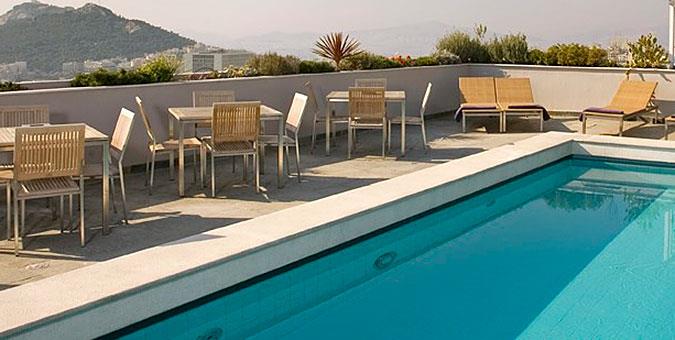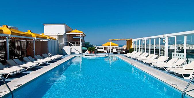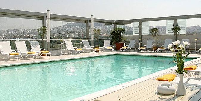 Fresh Design Hotel Σοφοκλέους 26, τηλ.: 210 5248511 Η Ακρόπολη σε πρώτο πλάνο και η upbeat μουσική του Air Lounge bar είναι τα δυνατά χαρτιά της πισίνας στον ένατο όροφο του funky Fresh Hotel, η οποία θα σας κάνει να ξεχάσετε ότι βρίσκεστε δύο βήματα από την Ομόνοια. Η είσοδος κοστίζει 20€ (περιλαμβάνοντα πετσέτες, αναψυκτικό ή καφές της επιλογής σας), ενώ αν την επισκεφτείτε μετά τις 16:00 το κόστος πέφτει στα 15€. Η τιμή παραμένει ίδια και τα Σαββατοκύριακα.