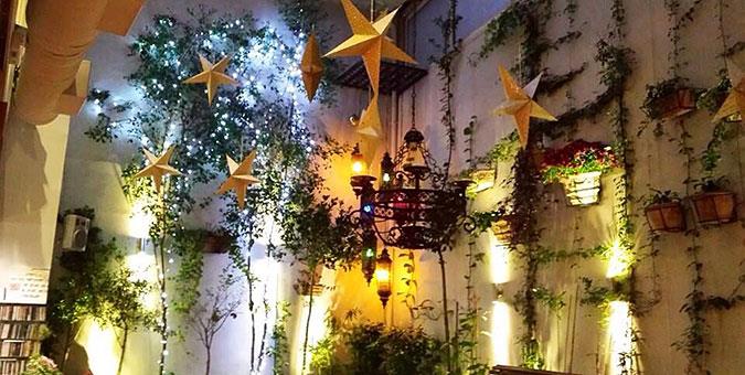 Ciccus Αδριανού 31, Μοναστηράκι, τηλ.: 210 3210420 Σε ένα από τα αγαπημένα μας στέκια στην Αδριανού, τα φαναράκια φωτίζουν ατμοσφαιρικά την μπάρα, οι χριστουγεννιάτικες μπάλες αιωρούνται πάνω από τις άνετες μαξιλάρες και από το μπαλκόνι και τα παράθυρα, απολαμβάνουμε όχι μόνο την απίστευτη θέα προς την Ακρόπολη και το Αστεροσκοπείο, αλλά και τα στολίδια και το γκι που αγκαλιάζει τα κάγκελα. Αγαπημένο μας σημείο, το «χειμωνιάτικο» αίθριο με τα χρυσά αστέρια που κρέμονται και τα λαμπιόνια που κάνουν παρέα με τα αναρριχώμενα φυτά. Εκεί, δοκιμάζουμε εξαιρετικό καφέ αλλά και μεσογειακά πιάτα αν πεινάσουμε.