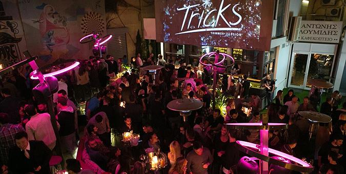 Tricks Κασσαβέτη 3, Κηφισιά Σούπερ καλοκαιρινό, στο αίθριο που βγάζει από την οδό Κασσαβέτη στη λεωφόρο Κηφισίας, το ολόφρεσκο μπαρ της Κηφισιάς είναι κεφάτο και υπόσχεται βραδιές χορού, με διαφορετικά πάρτι και DJs κάθε μέρα της εβδομάδας: Mainstream Τρίτη, Πέμπτη και Παρασκευοσάββατα, αυστηρά και μόνο ελληνικά τις Κυριακές. Αν πεινάσετε, στα τραπεζάκια του καταφτάνουν οι ασιατικές σπεσιαλιτέ του παρακείμενου Wagamama. Το Tricks θα το βρείτε ανοιχτό καθημερινά από τις 21.00 μέχρι (πολύ) αργά.