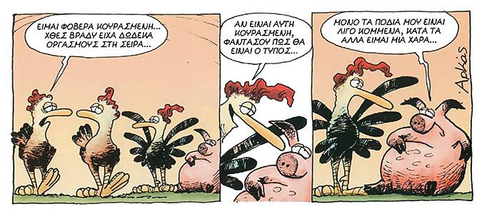 Ο Κόκκορας Αυστηρά και μόνο με δύο κάπα, όπως το γράφαμε το μακρινό 1981, όταν μας έκανε για πρώτη φορά να γελάσουμε από τις σελίδες της Βαβέλ. Μετακόμισε μετά στο Παρά Πέντε, όπου συνέχισε να λογοφέρνει με το γουρούνι ως το 1987.