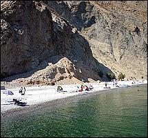 Χαρακτηριστικό της, ο τρομερός γκρεμός που ορθώνεται από πάνω της και τα πρασινογάλαζα νερά, ενώ το όνομά της το πήρε από το γεγονός ότι αν σκάψεις στην άμμο, αναβλύζει παγωμένο γλυκό νερό από τα Λευκά Όρη.