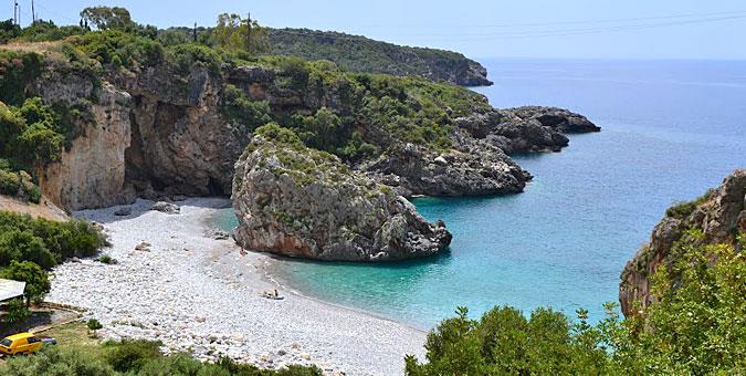 Φονέας: Γαλαζοπράσινα νερά, μεγάλα λευκά βότσαλα, φουντωτά δέντρα να της προσφέρουν απλόχερα την σκιά τους, και επιβλητικά βράχια στο πίσω μέρος της, συνθέτουν μια από τις ωραιότερες παραλίες της περιοχής. Θα τη βρείτε λίγο μετά την Καρδαμύλη, στο δρόμο προς Αρεόπολη.