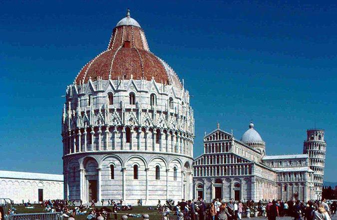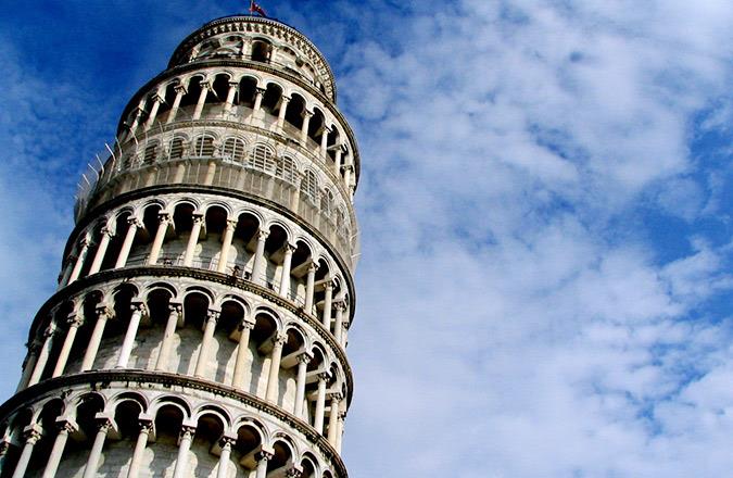 -Ο επικλινής Πύργος της Πίζας: Το διάσημο κτίσμα που γέρνει είναι όπως αναφέραμε και πιο πάνω το καμπαναριό του Καθεδρικού ναού. Την κλίση του την οφείλει στην σύσταση του εδάφους της περιοχής, που δεν είναι αυτό που θα λέγαμε ιδανική για ψηλά κτίρια. Γι’ αυτό και το κτίσμα είχε αρχίσει να παίρνει κλίση πριν καν ολοκληρωθεί – τα πρώτα προβλήματα παρατηρήθηκαν όταν είχαν χτιστεί οι τρεις πρώτοι από τους οκτώ ορόφους του. Σήμερα, χάρη σε ένα κολοσσιαίο έργο διατήρησης, ο ύψους 60 μέτρων Πύργος παραμένει όρθιος, αλλά με κλίση περίπου 4 μοιρών. Ελαφριά κλίση, παρ’ ότι όχι εμφανή, παρουσιάζουν και τα υπόλοιπα κτίσματα της Piazza del Duomo.