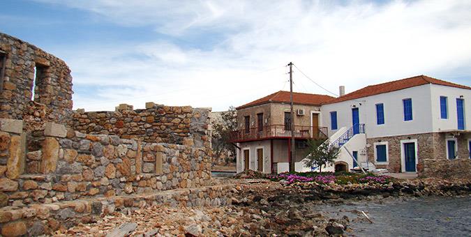 Χρωματιστά σπιτάκια με κόκκινες κεραμιδοσκεπές, λουλουδιασμένα παρτέρια στην άκρη του δρόμου, απόλυτα τιρκουάζ νερά που διακρίνονται σχεδόν από κάθε γωνία του χωριού, και μια ησυχία ονειρική. Τρία μαγαζάκια απλώνουν τα θαλασσιά τραπέζια τους σε ένα μεγάλο πλάτωμα-μπαλκονάκι με υπέροχη θέα στην παραλία, και ένα εντελώς χειροποίητο μπαρ με καλαμιές και ξύλινα καναπεδάκια φροντίζει για τα ποτά και τα καφεδάκια μας, από το βράδυ ως το πρωί, υπό τους ήχους jazz και έντεχνης μουσικής.
