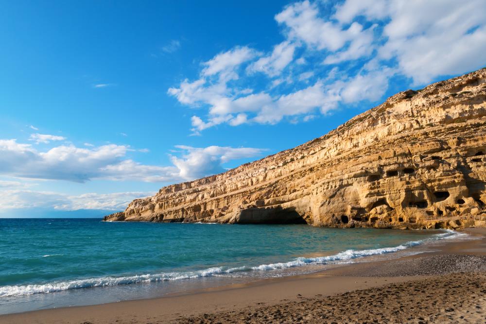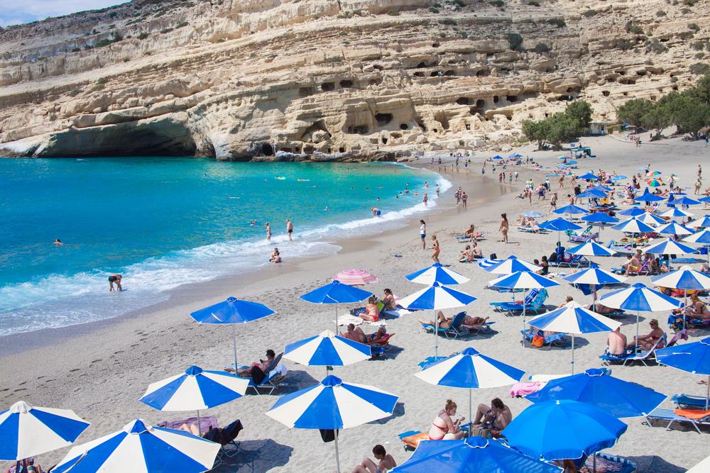 Κρυστάλλινα, βαθυγάλαζα νερά πλάι σε χρωματιστά βοτσαλάκια, έκταση τέτοια ώστε να χωρά τους πάντες –ξαπλωστρολάτρεις και ξαπλωστρομάχους– και ένα μαγικό ηλιοβασίλεμα, με τον ήλιο να βάφει τις λαξευμένες στο βράχο σπηλιές πορτοκαλοκόκκινες, συνθέτουν το σκηνικό της παραλίας των Ματάλων. Οι λάτρεις της απομόνωσης, τον Αύγουστο περπατούν ένα 20λεπτο μέχρι την πολύ πιο ήσυχη Κόκκινη Άμμο (φωτό, κάτω) την οποία αγαπούν και οι γυμνιστές..jpg)