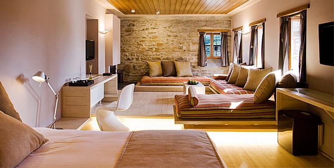 Στις οκτώ υπέροχες σουίτες του, η παράδοση συναντά την διακριτική πολυτέλεια: Όλες τους διαθέτουν ιδιωτική είσοδο, ανεμπόδιστη θέα, ένα ή δύο τζάκια, τηλεοράσεις 32 '' HD, μηχανές Nespresso και υποδοχές iPod, ενώ οι περισσότερες προσφέρουν επίσης ιδιωτική βεράντα ή μπαλκόνι. Τα έπιπλα, ξεχωριστά και ιδιαίτερα, σε συνδυασμό με τους κρυφούς φωτισμούς, συνθέτουν ένα σύγχρονο και αφαιρετικό αποτέλεσμα. Τα ευρύχωρα μπάνια είναι πλήρως εξοπλισμένα με ανέσεις υψηλής ποιότητας, πετσέτες και μπουρνούζια, ενώ στην πλειονότητά τους προσφέρουν και Jacuzzi. Χαλαρώστε στα εξαιρετικά άνετα king size κρεβάτια και απολαύστε τις μικρές λεπτομέρειες που ομορφαίνουν τη ζωή.