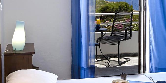Κυκλαδίτικη διακόσμηση, κατάλευκοι ασβεστωμένοι τοίχοι, περιποιημένα δωμάτια με παροχές που περιλαμβάνουν ψυγείο, τηλεόραση και δωρεάν wi-fi. Και όλα αυτά, σε απόσταση απλώνω-χέρι-και-πιάνω-θάλασσα (σε απόσταση τριών μέτρων από την θάλασσα, αν το προτιμάτε αντικειμενικότερα).
