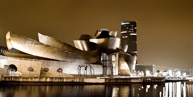 Guggenheim Μπιλμπάο, Ισπανία Το αριστούργημα αρχιτεκτονικής που σχεδίασε ο Frank Gehry στεγάζει από το 1997, οπότε και εγκαινιάστηκε, το Μουσείο Μοντέρνας Τέχνης του Μπιλμπάο. Είναι ένα από τα λίγα μουσεία στον κόσμο που είναι πιο ενδιαφέροντα εξωτερικά απ’ ό,τι εσωτερικά. Συγκαταλέγεται, όμως, παρ’ όλα αυτά στα κορυφαία μουσεία της Ευρώπης, όχι μόνο γιατί αποτελεί έκθεμα αφ’ εαυτού, αλλά και για τα ενδιαφέροντα έργα μοντέρνας τέχνης που φιλοξενεί.