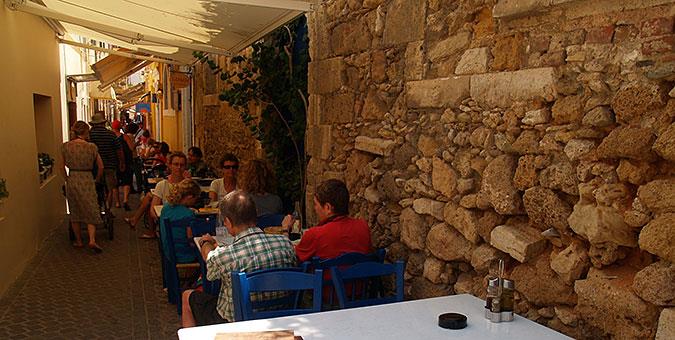 Καρνάγιο Πλατεία Κατεχάκη 8, Παλιά Πόλη, τηλ: 2821 053366 Σε μια λουλουδιασμένη γωνιά πίσω από το Μεγάλο Αρσενάλι, θα δοκιμάσετε ωραιότατη μακαρονάδα θαλασσινών και κλασικά κρητικά πιάτα, όπως χοχλιούς και καλιτσούνια. Οι τιμές κυμαίνονται στα 15€ το άτομο.