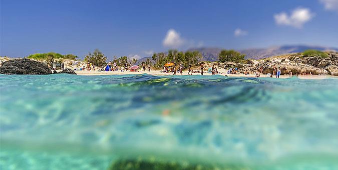 Ελαφονήσι Στα νότια του Νομού Χανίων, 78 χιλιόμετρα από τα Χανιά Η εξωτικότερη των εξωτικών παραλιών της Κρήτης έχει νερά τόσο γαλάζια που μοιάζουν ψεύτικα –κι η ροζ άμμος στην οποία καταλήγουν το κάνει ακόμα πιο δύσκολο να πιστέψεις ότι το τοπίο μπροστά στα μάτια σου είναι αληθινό. Βέβαια, οι κακές γλώσσες θα σας πουν ότι τα νερά είναι τόσο ρηχά και τόσο ζεστά που δεν ενδείκνυνται για κολύμπι, και ότι η πολυκοσμία τον Αύγουστο κάνει τις ξαπλώστρες να απλώνονται και μέσα στο νερό –και δεν θα έχουν εντελώς άδικο. Οι λάτρεις των εξωτικών τοπίων και της απομόνωσης περπατούν μέσα στο νερό, μέχρι το εξίσου υπέροχο νησάκι απέναντι, με τους λευκούς αμμόλοφους και το σωστό βάθος των νερών.