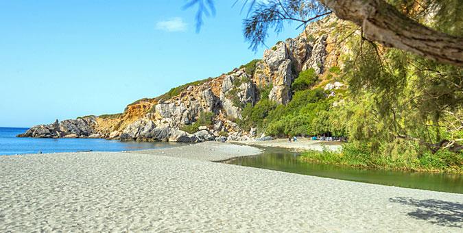 Πρέβελη Στα νότια του νομού Ρεθύμνου, 40 περίπου χιλιόμετρα από το Ρέθυμνο Στο τέλος του καταπράσινου Κουρταλιώτικου Φαραγγιού, κρυμμένη πίσω από ένα υπέροχο φοινικόδασος –μικρότερο μεν, λιγότερο τουριστικό δε από εκείνο του Βάι– η πιο ξακουστή παραλία του Ρεθύμνου έχει κρυστάλλινα ανοιχτογάλαζα νερά, χρυσαφένια άμμο και τρεχούμενα νερά που έρχονται από το φαράγγι για να καταλήξουν στην θάλασσα.