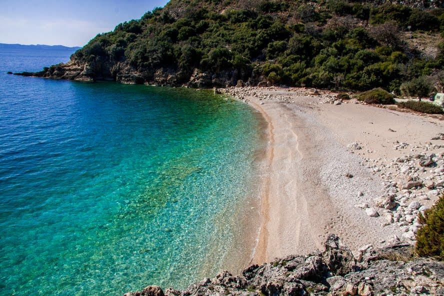 Υπέροχα, σμαραγδένια νερά, ολόλευκα βότσαλα και φουντωτή βλάστηση που φτάνει σχεδόν ως το κύμα. Είναι, στην ουσία, τρεις διαφορετικές παραλίες: Η πρώτη με τις ξαπλώστρες και την λαοπλημμύρα της, η δεύτερη στην οποία έρχονται περπατώντας το μονοπάτι ή κολυμπώντας αυτοί που θέλουν λίγη περισσότερη ησυχία, και η τρίτη, η αγαπημένη των ερημιτών, που προσεγγίζεται μόνο κολυμπώντας.