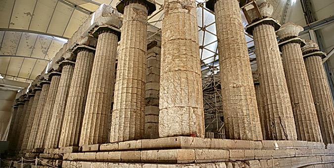 Και για να περάσουμε στις λιγότερο εντυπωσιακές πληροφορίες: Κτίστηκε στα μέσα του 5ου αιώνα π.Χ., σε ένα λόφο με πανοραμική θέα σε ένα απόκοσμο τοπίο –εκεί όπου τα βουνά της Αρκαδίας συναντούν τις απέραντες πεδιάδες της Ηλείας. Είναι καλυμμένος από ένα μάλλον άχαρο στέγαστρο, για να προστατεύεται από τα καιρικά φαινόμενα που τον χτυπούσαν ανελέητα. Και είναι, τέλος, ο αγαπημένος αρχαίος ναός των κυνηγών παραφυσικών φαινομένων, αφού σύμφωνα με μια θεωρία είναι κτισμένος επάνω σε μια βάση η οποία… περιστρέφεται, με κάποιον μυστηριώδη τρόπο. Θα τον βρείτε στις Βασσές της Φιγαλείας, 14 χιλιόμετρα έξω από την Ανδρίτσαινα.