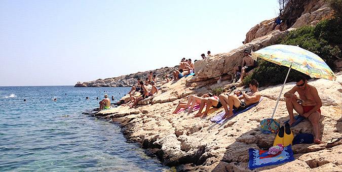 Λιμανάκια, Βουλιαγμένη Ούτε ένας, ούτε δύο, αλλά πολλοί βραχώδεις κολπίσκοι με πεντακάθαρα κρυστάλλινα νερά αποτελούν μία από τις καλύτερες επιλογές στη Βουλιαγμένη, όπου οι λουόμενοι δεν πτοούνται από τις «ιδιαιτερότητες», δηλαδή το γεγονός πως δεν υπάρχει άμμος για να απλώσεις την πετσέτα σου, αλλά μόνο πλατιά βράχια. Δείτε αναλυτικά την εμπειρία της βουτιάς στα Λιμανάκια σε σχετικό αφιέρωμα του in2life. Πώς θα πάτε: Έξω από τον σταθμό του μετρό Ελληνικό, βρίσκεται η αφετηρία του σωτήριου λεωφορείου Ε22, που είναι το εξπρές λεωφορείο του ΟΑΣΑ το οποίο συνδέει το Ελληνικό με το Σούνιο και διαθέτει κοινό εισιτήριο με αυτό του μετρό (1,40€) και θερινά δρομολόγια ανά 15-20 λεπτά μέχρι τα μεσάνυχτα. Από το Ελληνικό μέχρι τα Λιμανάκια θα χρειαστείτε περί τα 15’ διαδρομής για να κατεβείτε στη στάση Α’ Λιμανάκια, που αντιστοιχεί στον πρώτο και δεύτερο όρμο. Η αμέσως επόμενη στάση είναι τα Β’ Λιμανάκια, που αντιστοιχεί στον τελευταίο μεγάλο όρμο, ο οποίος προτιμάται από τους γυμνιστές – εδώ θα χρειαστεί να κατεβείτε ένα σχετικά απότομο μονοπάτι.