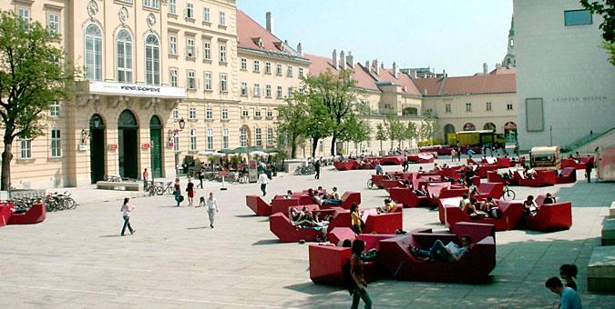 *Το Τετράγωνο των Μουσείων Στην ίδια περιοχή, στα όρια του ιστορικού κέντρου, οι στάβλοι των Αψβούργων έχουν μετατραπεί σε ένα πελώριο σύμπλεγμα μουσείων, το MuseumsQuartier, όπου ξεχωρίζουν το εξαιρετικά ενδιαφέρον Μουσείο Μοντέρνας Τέχνης (MUMOK), το Κέντρο Μοντέρνας Τέχνης (Kunsthalle), το Κέντρο Αρχιτεκτονικής, το Leopold Museum (αφιερωμένο στα κινήματα του μοντερνισμού και του εξπρεσιονισμού), το παιδικό μουσείο ZOOM, θεατρικές σκηνές και το Quartier 21, αφιερωμένο στον πολιτισμό του 21ου αιώνα.