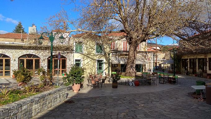 Τα διώροφα σπιτάκια του σκεπάζονται από κατακόκκινα κεραμίδια, η πλακόστρωτη πλατεία απλώνεται κάτω από τα γιγάντια κλαδιά ενός χιλιόχρονου πλάτανου. Ακριβώς δίπλα, το καφενείο σερβίρει μυρωδάτο ελληνικό στη χόβολη, μαζί με τα τελευταία νέα του χωριού, ενώ από την άλλη πλευρά της πλατείας ένα αρχοντικό του 18ου αιώνα έχει μετατραπεί στον πανέμορφο ξενώνα που δανείζεται το όνομα του χωριού –λεπτομέρειες παρακάτω. Στενά δρομάκια ανηφορίζουν προς τις επάνω γειτονιές, που ευωδιάζουν από τα τζάκια τους.