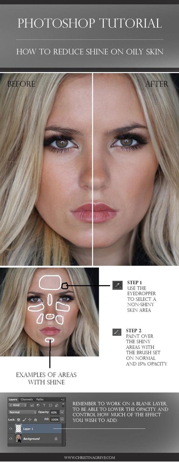 Σβήστε τη γυαλάδα της λιπαρής επιδερμίδας Απλώς χρησιμοποιήστε το eyedropper για να επιλέξετε μία περιοχή που δεν γυαλίζει, και εν συνεχεία με το βουρτσάκι «ζωγραφίστε» τα σημεία με γυαλάδα, ρυθμίζοντας το opacity στο 15%.