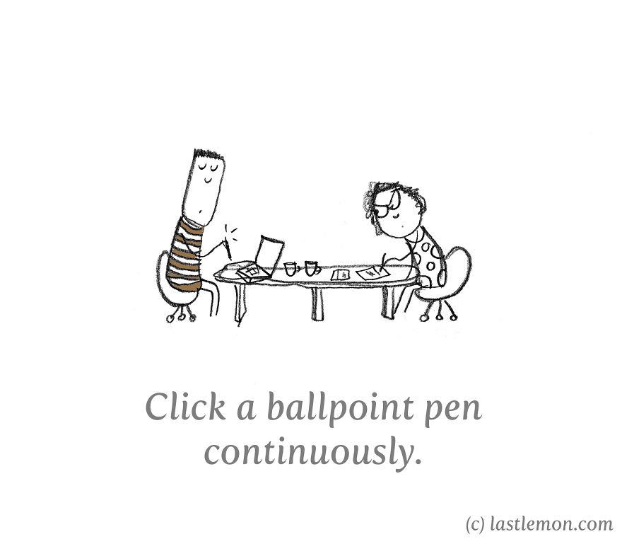 Δανειστείτε το στιλό κάποιου άλλου και μασήστε το Μην σταματάτε στιγμή να τσεκάρετε το κινητό σας Απαντήστε στα email σας με κεφαλαία Γράψτε λάθος το όνομα κάποιου Περισσότεροι τρόποι να γίνεις ενοχλητικός, στο Bored Panda, και τη σελίδα των Last Lemon