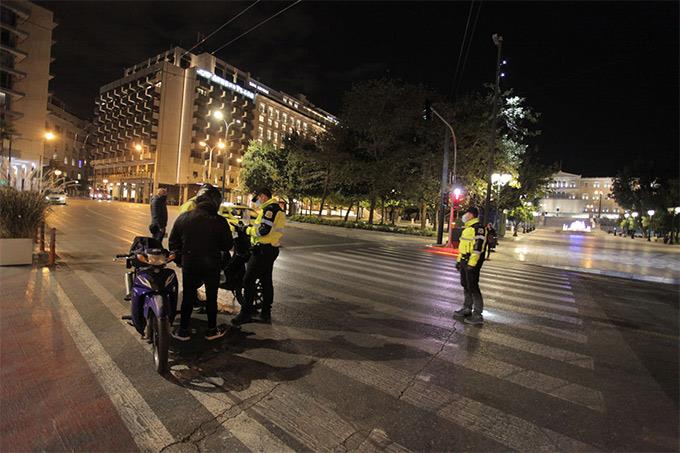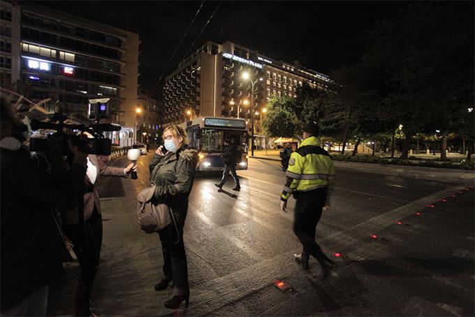 Παρασκευή βράδυ στις 21.30, πρώτη μέρα απαγόρευσης της νυχτερινής κυκλοφορίας. Από το μπλόκο της αστυνομίας στο Σύνταγμα δεν περνάει κανείς: Αυτοκίνητα, μηχανάκια, ταξί, λεωφορεία, όλοι σταματιούνται και όλοι ελέγχονται.
