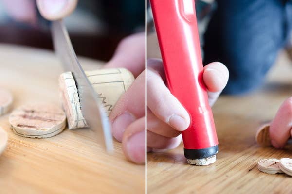 Φτιάξε προστατευτικά πατώματος για τις καρέκλες ή το τραπέζι ή τον καναπέ από φελλό κρασιού. Κόψε σε φετούλες τον φελλό και κόλλα τον (ιδανικά με θερμόκολλα) στα ποδαράκια της καρέκλας.