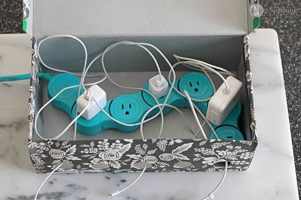 Βάλε το πολύπριζο μέσα σε άδειο κουτί παπουτσιών. Άνοιξε τις απαραίτητες τρύπες για να βγαίνουν τα καλώδια, βάλε διακοσμητικό χαρτί περιτυλίγματος, και δε θα ξαναπάθεις νευρικό κλονισμό με τα καλώδια.
