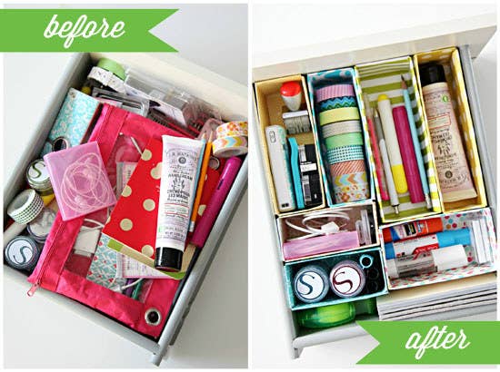 Τα χάρτινα κουτιά δημητριακών μπορούν να κάνουν θαύματα. Άνοιξε το συρτάρι σου, τοποθέτησε τα κάθετα, με τέτοιον τρόπο σαν να παίζεις τέτρις, κι ό,τι εξέχει κοφ’ το. Μετά πάρε χαρτί περιτυλίγματος και θωράκισε το χαρτόνι σου. Έτοιμο.