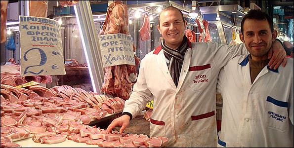 Το μαγειρείο Παπανδρέου βρίσκεται στην ίδια θέση μέσα στη Βαρβάκειο από το 1898. «Οι τιμές μας είναι ίδιες εδώ και τρία χρόνια. Απορροφήσαμε και την τελευταία αύξηση του ΦΠΑ, κι αυτό φυσικά σημαίνει ότι δυσκολεύουν τα πράγματα περισσότερο για μας» λέει ο κ. Φυντανίδης, υπεύθυνος του μαγειρείου (στη φωτό, δεξιά, μαζί με τον ιδιοκτήτη, Αντώνη Παπανδρέου).