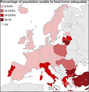 Στην αδυναμία εξασφάλισης αποτελεσματικής θέρμανσης, η Ελλάδα βρίσκεται στην πέμπτη θέση στην Ευρώπη (26% των Ελλήνων), όπως φαίνεται και στον παρακάτω πίνακα. Τις πρώτες θέσεις καταλαμβάνουν η Βουλγαρία (47%), η Λιθουανία (34%), η Κύπρος με 31% και η Πορτογαλία με 27%. Ο μέσος όρος στην ΕΕ είναι 11%.