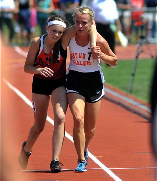 …Αυτή η αθλήτρια του στίβου που σταμάτησε για να βοηθήσει την τραυματισμένη συναγωνίστριά της (*) η 17χρονη Meghan Vogel από το Οχάιο ήταν στην τελευταία θέση του αγώνα δρόμου των 3.200 μέτρων όταν έφτασε την συναθλήτριά της Arden McMath, η οποία εκείνη τη στιγμή κατέρρεε. Αντί να την προσπεράσει και να αποφύγει έτσι την τελευταία θέση, έβαλε το χέρι της γύρω από τους ώμους της, την κουβάλησε 30 μέτρα και την έσπρωξε μπροστά στη γραμμή τερματισμού πριν την περάσει η ίδια.
