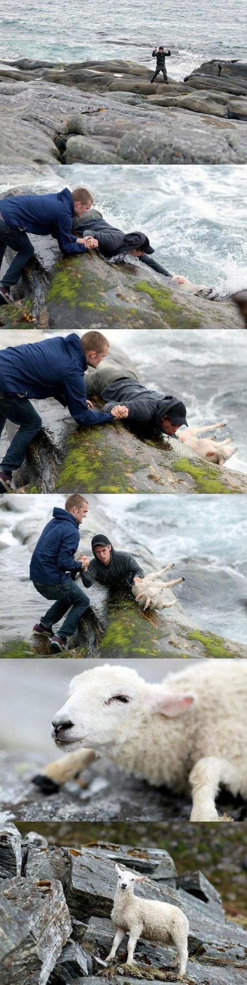 …Αυτοί οι δύο Νορβηγοί που σώζουν ένα πρόβατο από τον ωκεανό.