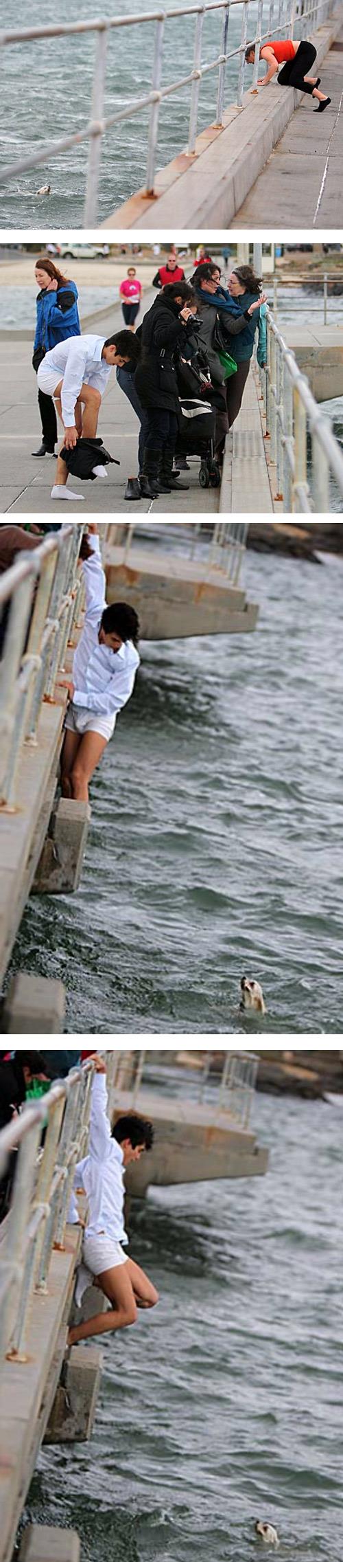 …Αυτός ο άνδρας που πήδηξε στα παγωμένα και βρώμικα νερά της Μελβούρνης για να σώσει ένα αβοήθητο σκυλάκι. (*) γίνεται ακόμα πιο συγκινητικό, όταν διαβάζεις παρακάτω στην είδηση, ότι ο ήρωας της ημέρας βρισκόταν στη γέφυρα από την οποία έπεσε το σκυλάκι, για να σκορπίσει τις στάχτες της μητέρας του στη θάλασσα.