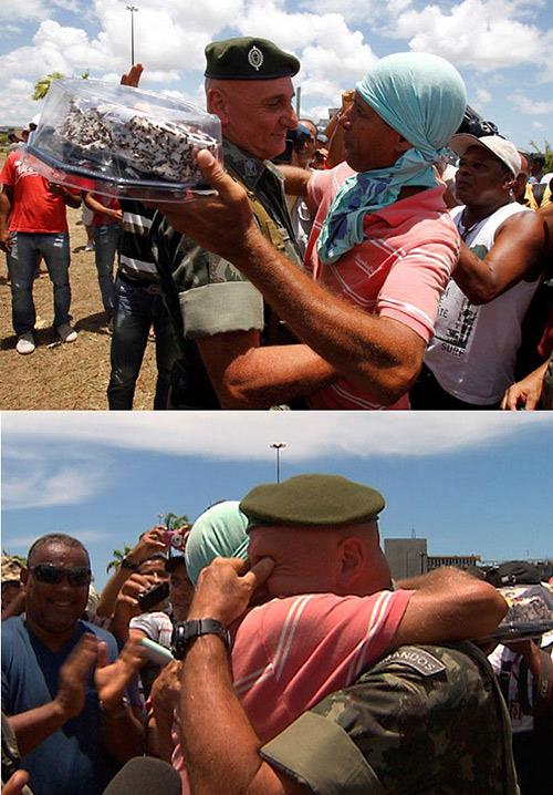 …Αυτή η αγκαλιά μεταξύ του διαδηλωτή και του στρατιωτικού στη Βραζιλία (*) Κατά τη διάρκεια μιας πορείας διαμαρτυρίας, στην οποία ο στρατιωτικός ακούστηκε να λέει «σε παρακαλώ, ας μη γίνουν φασαρίες! Όχι στα γενέθλιά μου». Εξ ου και η τούρτα στη φωτογραφία.
